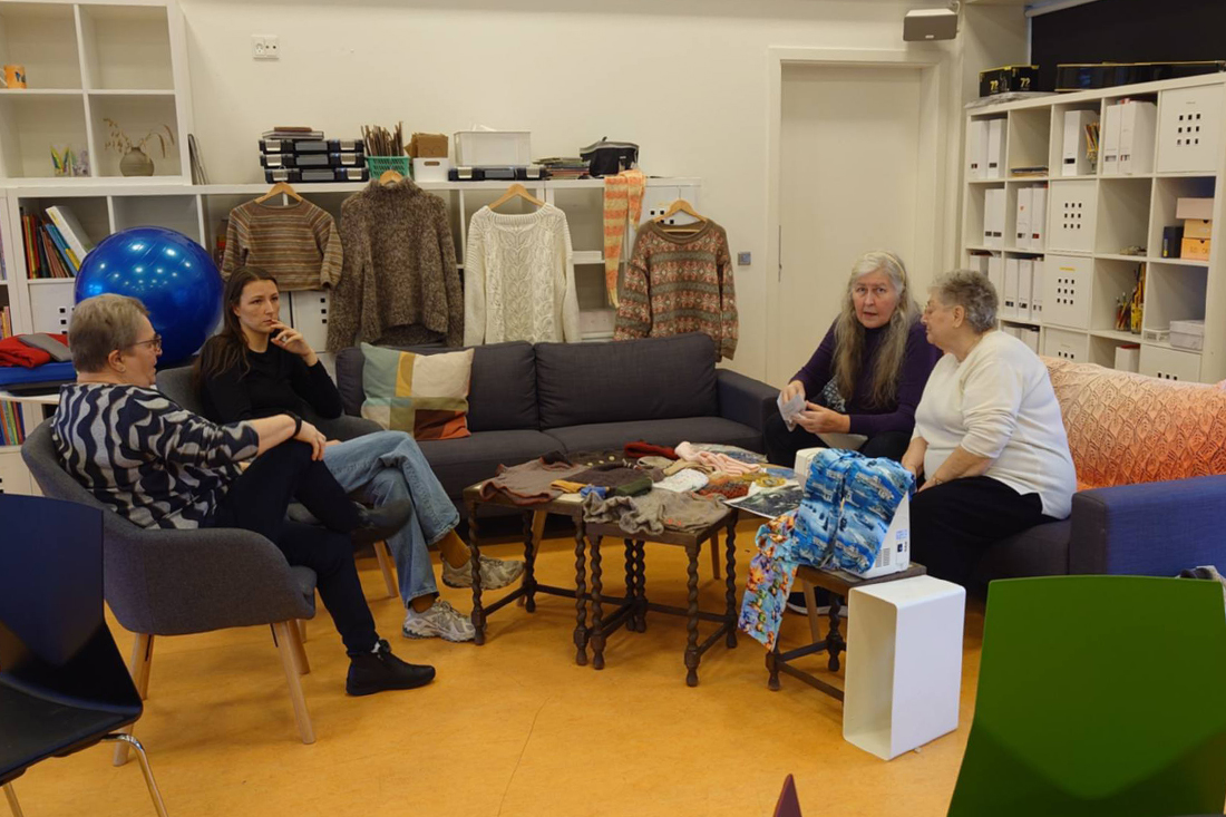 I strikkehjørnet sad beboere klar til at fortælle om deres strik og deres fællesskab Fra venstre: Anette, Catrine , Kirsten og yderst til højre Jytte Jensen, der er organisationsformand.
